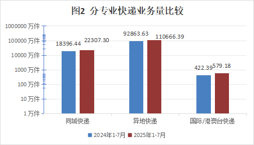 1-7月,同城快递业务量累计完成2.23亿件,同比增长21.26%;异地快递业务量累计完成11.07亿件,同比增长19.17%;国际/港澳台快递业务量累计完成579.18万件,同比增长37.12%。