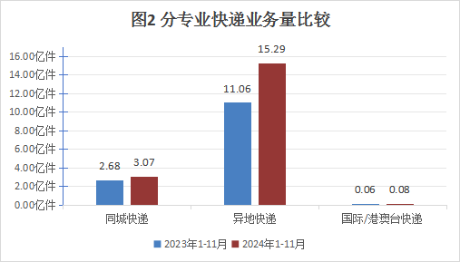 1-11月,同城快递业务量累计完成3.07亿件,同比增长14.61%;异地快递业务量累计完成15.29亿件,同比增长38.28%;国际/港澳台快递业务量累计完成790.17万件,同比增长37.84%。