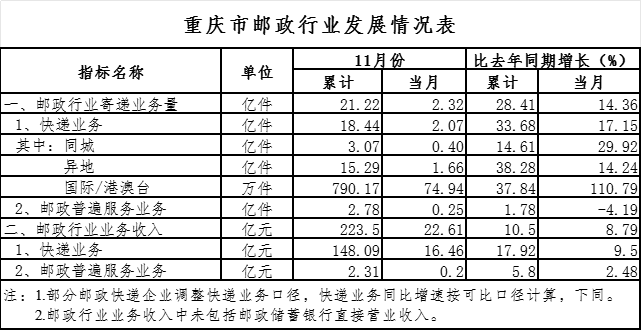 11月份,邮政行业业务收入完成22.61亿元,同比增长8.79%。其中,快递业务收入完成16.46亿元,同比增长9.5%。