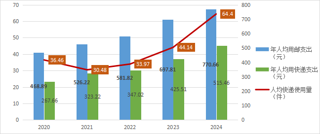 2020-2024年人均用邮支出、快递支出和快递使用量情况