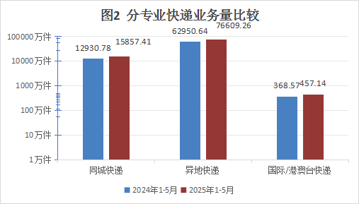 1-5月,同城快递业务量累计完成1.59亿件,同比增长22.63%;异地快递业务量累计完成7.66亿件,同比增长21.7%;国际/港澳台快递业务量累计完成457.14万件,同比增长24.03%。