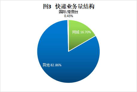 1-7月,同城、异地、国际/港澳台快递业务量分别占全部快递业务量的16.7%、82.86%和0.43%。与去年同期相比,同城快递业务量的比重上升0.23个百分点,异地快递业务量的比重下降0.29个百分点,国际/港澳台业务量的比重上升0.05个百分点。